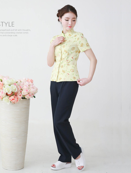 重庆订做嫩黄色印花护士服,短款分体护士服现货批发