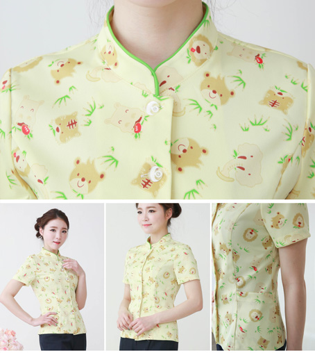 重庆订做嫩黄色印花护士服做工精细,短款分体护士服现货批发价格实在交货及时,女士收腰版型护士服质量可靠,欧迈服饰护士工作服定做厂家品质好.