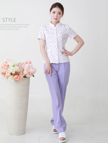 重庆定制立领短袖夏季护士服,粉色印花护士工作服套装