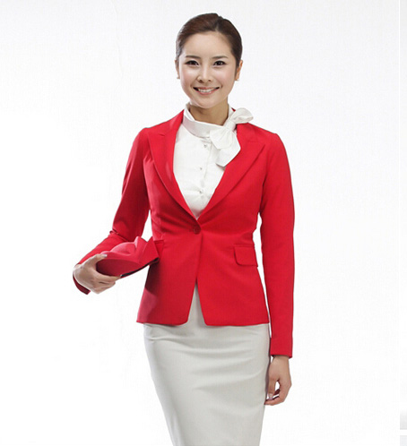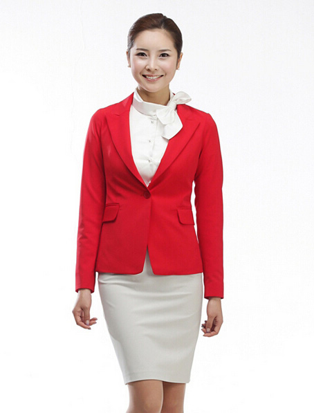 欧迈服饰专业女士西装定做厂家,红色会议接待人员职业装定制,女士西装职业装订做价格便宜实惠,订制前台红色职业装款式新颖,职业装制作贴牌加工公司.