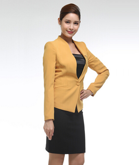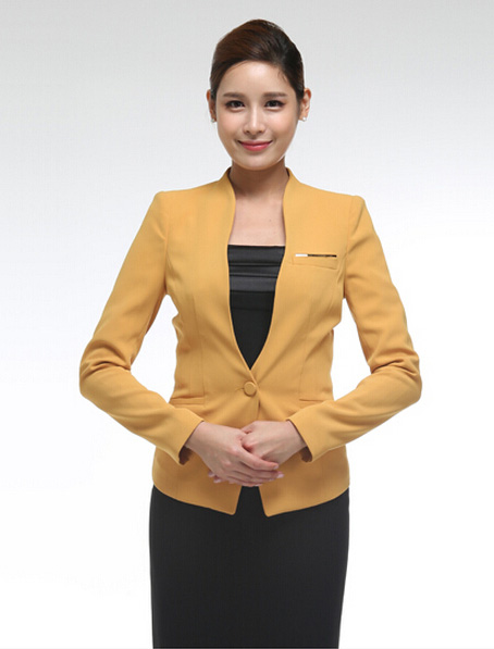 高档职业装面料定做厂家,女教师职业装量体订做公司首选欧迈服饰,致力于女款职业装定制开发,明黄色职业装设计样式经典时尚,职业装免费打样价格公道实惠.